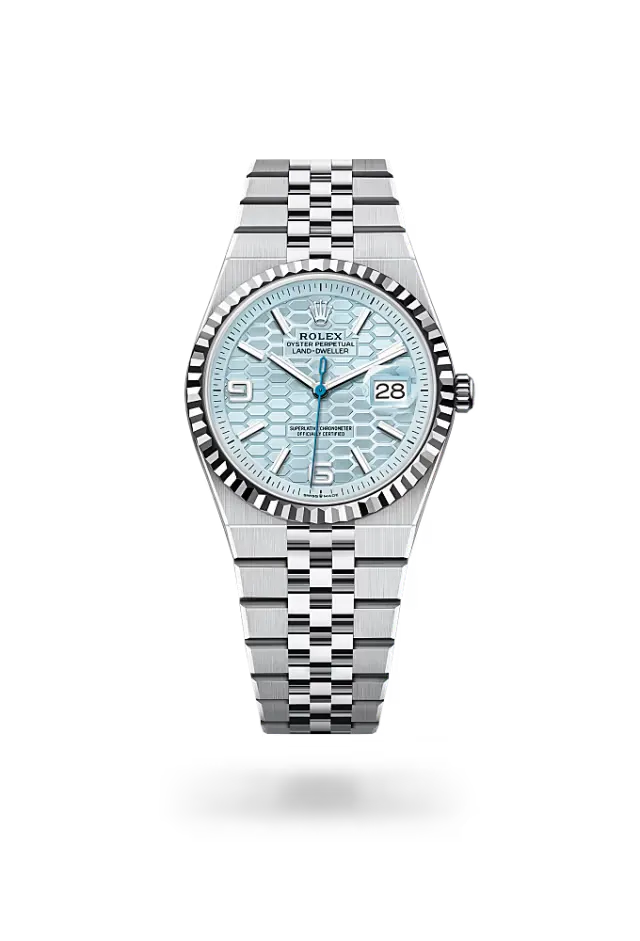 Brand Rolex Model Land-Dweller Reference 127236 Gender Women’s watch Movement Kinetic (Automatic) Case Diameter 36 mm Case Material Platinum Band Material Platinum (Flat Jubilee) Dial Color Ice blue Quality Swiss (ETA) Glass Sapphire crystal Water Resistance SuperClone watches are waterproof up to 30 meters